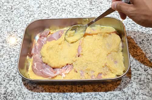 漬ける前と後の写真を比べてみると、トレーの四隅に濁った濃いめの黄色い液が少し溜まっています。これは味噌床の塩分によって鶏肉から出た水分です。